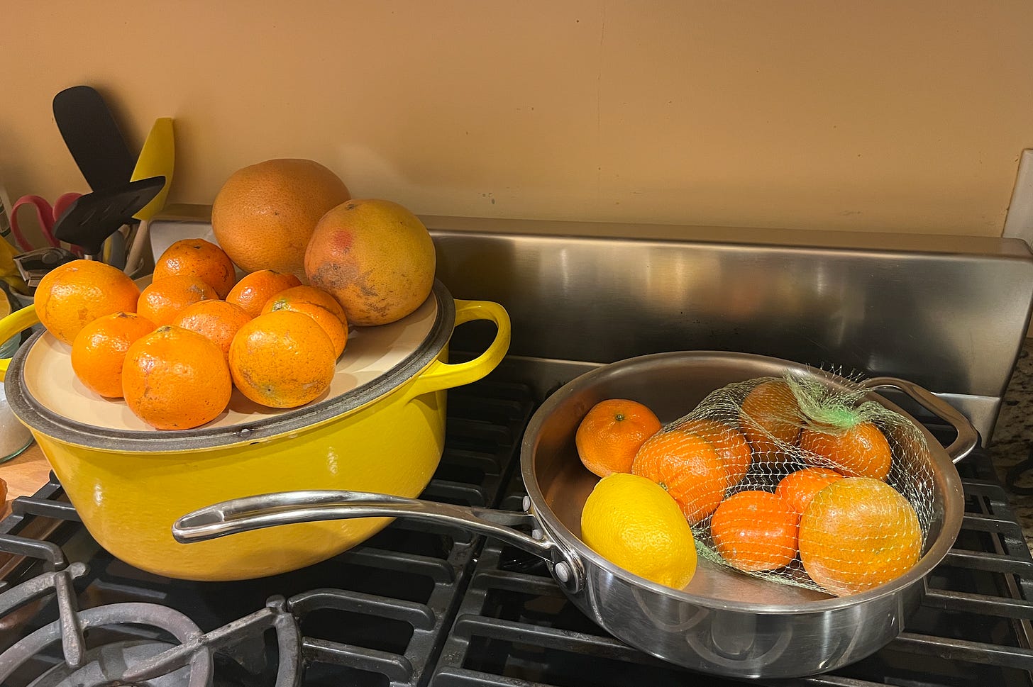 My brother brought citrus (sugar belles, honey tangerines, and grapefruits) from Florida; and some chopped liver, rye bread, and sesame bagels from the drive.