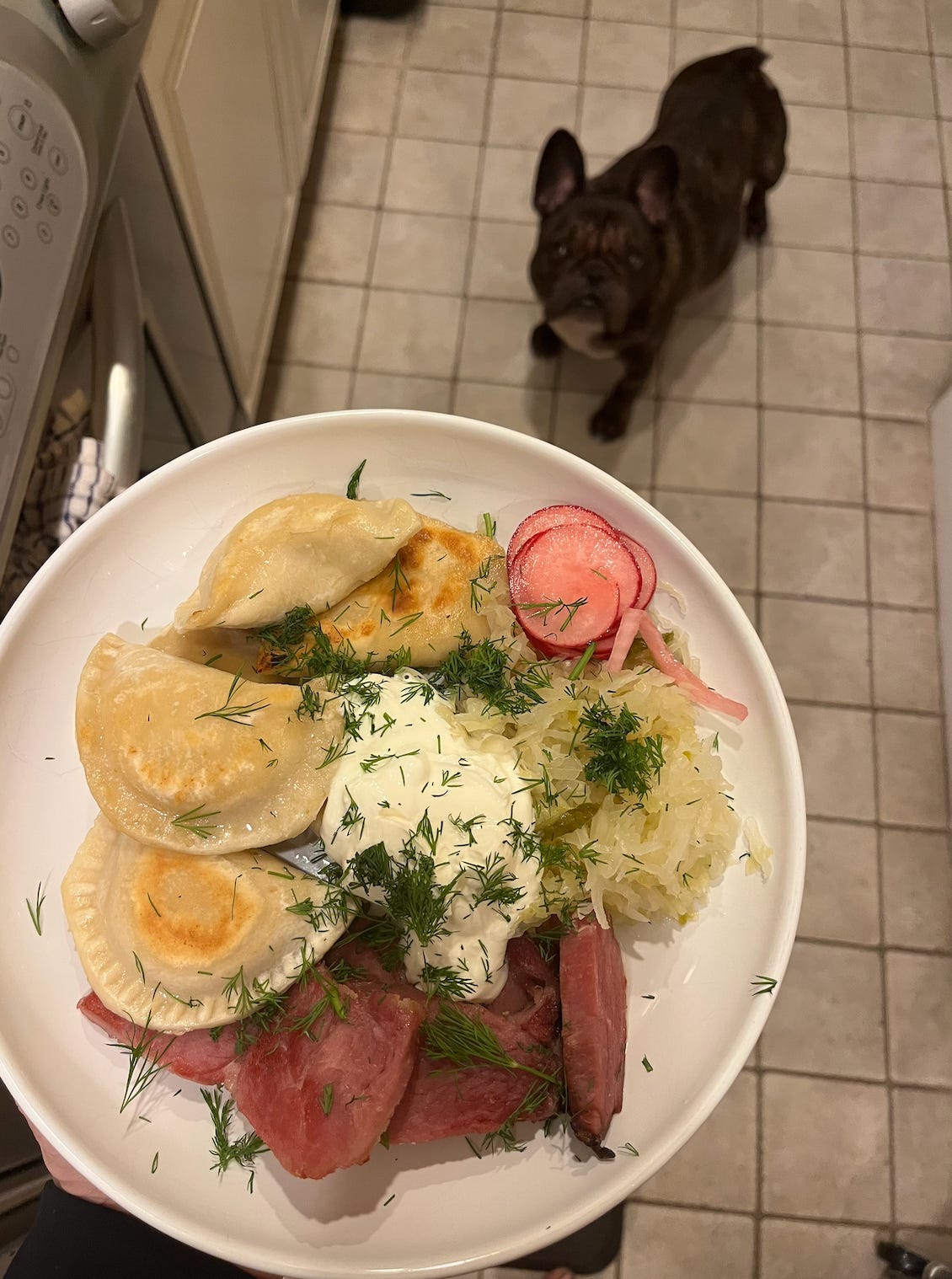 Tuesday: Jaju Pierogies with ham, sauerkraut, sour cream, dill, and pickled radish.