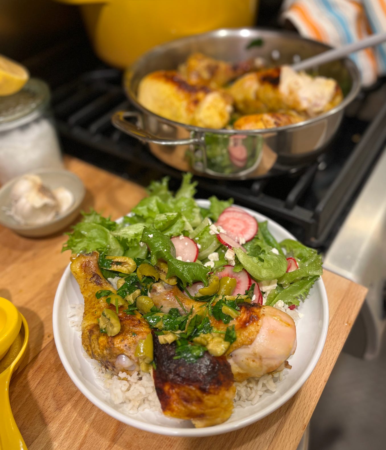 A LWJ favorite: chicken thighs, zucchini, rice (I’ll probably use some miso)